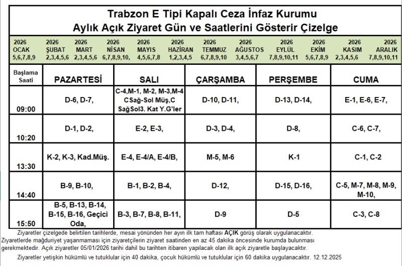 Not: Ziyaretçilerin görüş saatinden 45 dakika önce kayıt için kurum ziyaretçi kabul bürosunda bulunmaları önemle rica olunur.Ziyaret saati dışında ziyaretçi kabul edilmeyecektir.